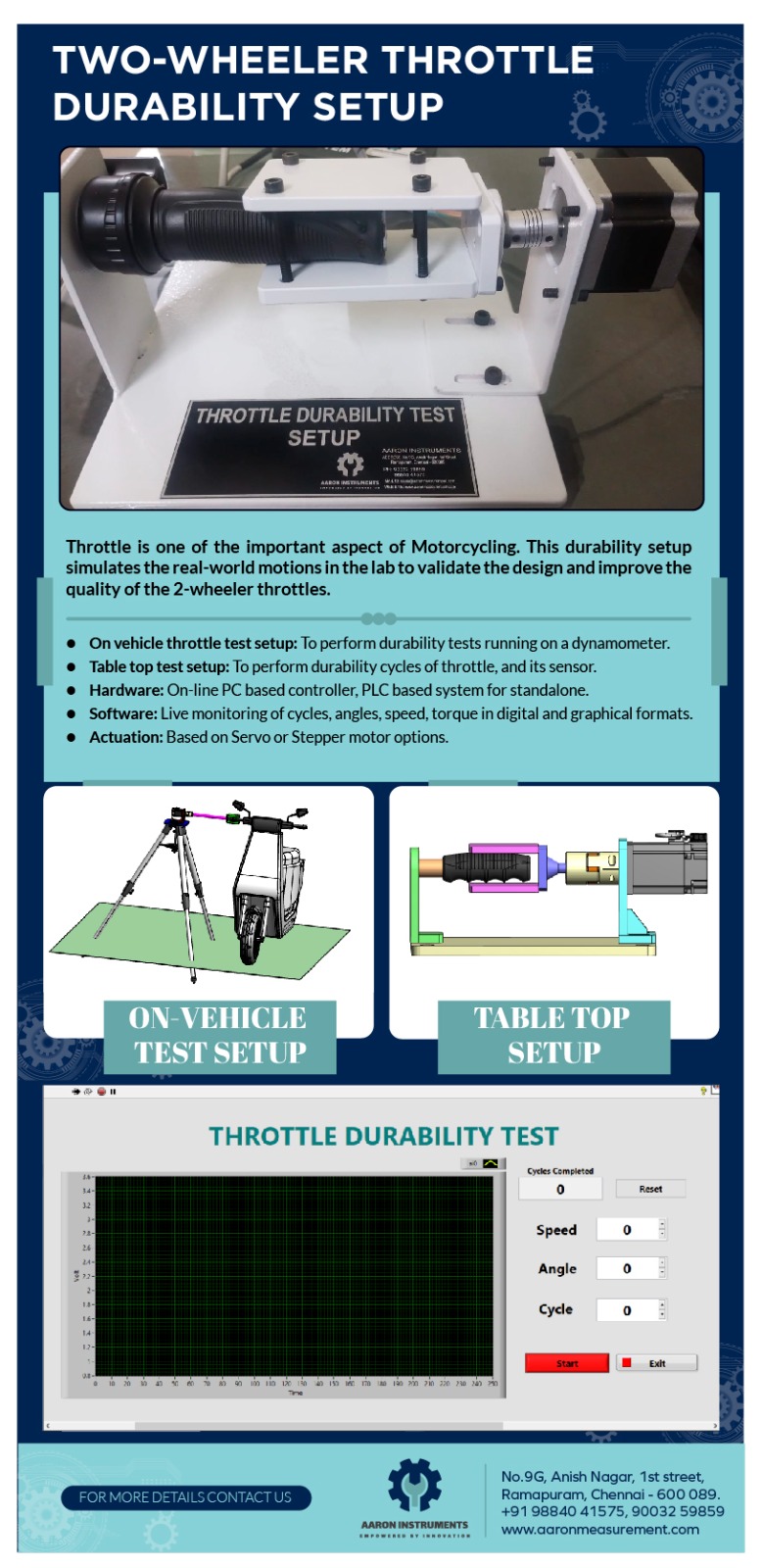 Throttle is one of the important aspect of Motorcycling. This durability setup simulates the real-world motions in the lab to validate the design and improve the quality of the 2-wheeler throttles.